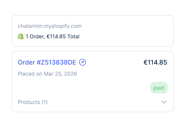 Mit Chatarmin kannst du nativ deine Kundendaten zwischen Shopify und WhatsApp synchronisieren. Zusätzlich sind alle deine aktuellen Produkte mit Preisen, Verfügbarkeit und Varianten in WhatsApp abrufbar.